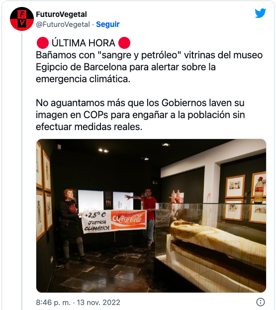 報道稱,兩名抗議人士是西班牙環保組織“未來植物(Futuro Vegetal)”的成員。該組織在一份聲明表示,可口可樂是在埃及舉行的聯合國氣候峯會官方贊助商之一,而該公司是“全球塑料污染最大貢獻者”。“未來植物”還稱,希望通過抗議活動強調“全球氣温上升將導致氣候不穩定,並在整個星球上造成嚴重後果”。據報道,警方抵達現場後未逮捕兩名抗議人士,但館方表示將提出索賠要求。