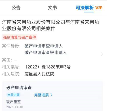 據天眼查顯示,宋河酒業新增一條“破產重整”信息,案號為(2022)豫1628破申3號,案件類型為破產審查案件,經辦法院為鹿邑縣人民法院,申請人和被申請人均為河南省宋河酒業股份有限公司。