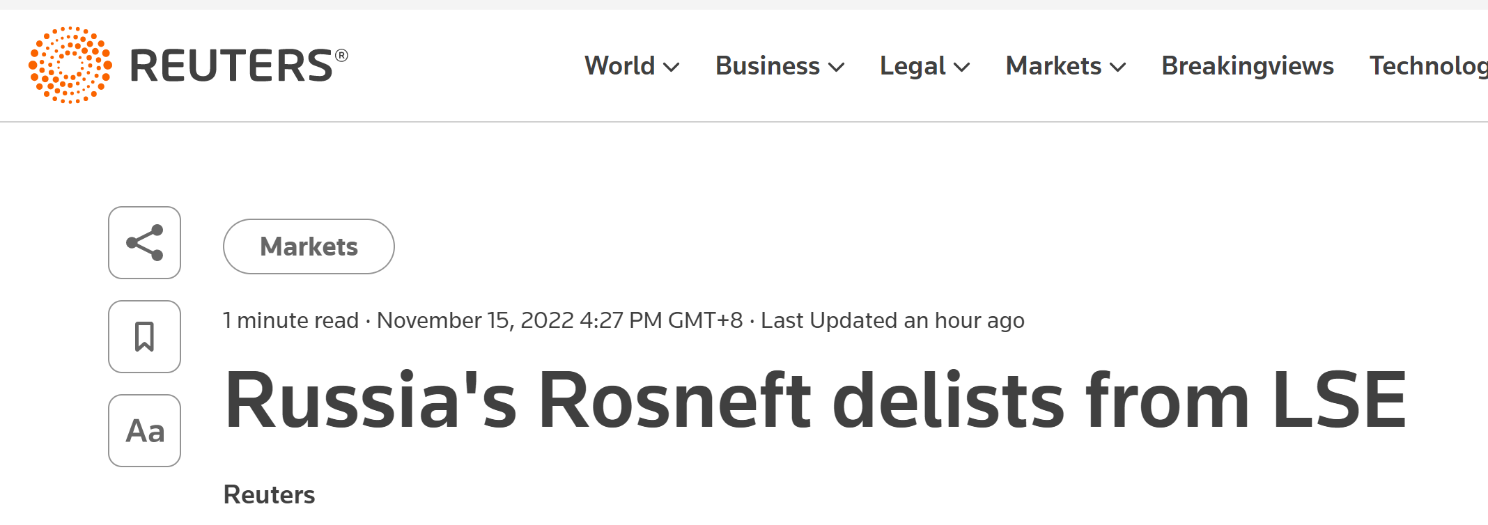 【環球網報道 見習記者 李詩睿】據路透社消息,俄羅斯石油公司(Rosneft)11月15日表示,其全球存託憑證(GDR)已從倫敦證券交易所(LSE)退市。此前,其他俄羅斯公司在西方制裁後也採取了類似措施。