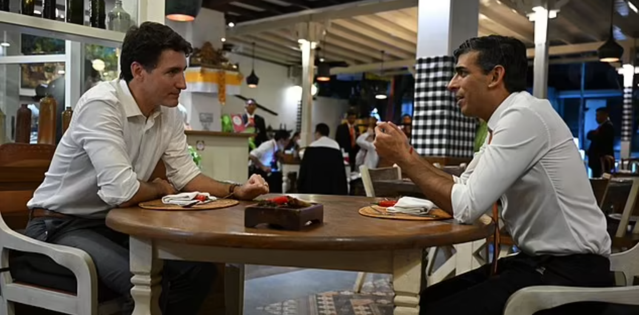二十國集團(G20)領導人第十七次峯會於11月15日至16日在印度尼西亞巴厘島舉行。綜合英國《衞報》、《每日郵報》等媒體報道,抵達巴厘島當天,英國首相蘇納克與加拿大總理特魯多在巴厘島當地一家餐廳小聚,兩人點了酒水和小吃,邊喝邊聊,蘇納克隨後還在推特上曬圖透露在這期間又遇上了日本首相岸田文雄。