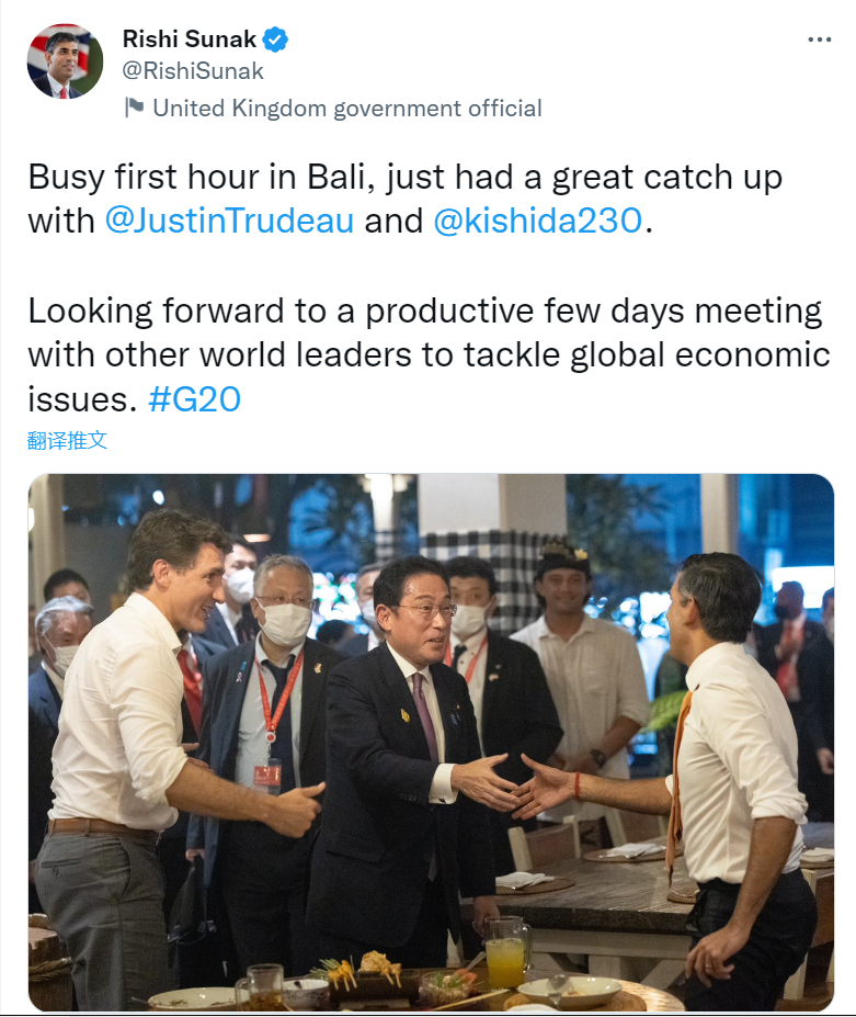 當天,蘇納克還在推特上曬出自己和特魯多在餐廳小聚遇到日本首相岸田文雄的照片。蘇納克發文稱,“在巴厘島的第一個小時很忙碌,剛剛與特魯多和岸田文雄敍了一下舊。期待與其他世界領導人就解決全球經濟問題進行富有成效的幾天會談。”↓