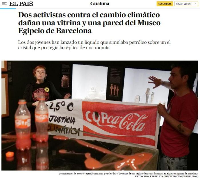 這幾名抗議者來自一個名叫“未來植物”的西班牙氣候活動組織。進入博物館後,他們將可口可樂瓶子中的粘稠液體澆在裝有木乃伊展品的玻璃櫃上,還把液體潑向周邊牆上的展品。