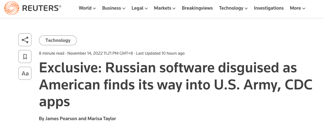 路透社稱,美國疾病控制和預防中心表示受了欺騙,以為這家名為Pushwoosh的軟件公司總部位於美國,並提供代碼和數據處理工具。美國疾病控制和預防中心發言人克里斯汀·諾德倫德稱,該公司其實是俄羅斯人所有,因此“存在潛在的安全問題”。美國陸軍對路透社表示,出於安全考慮,在今年3月刪除了有Pushwoosh代碼的應用程序,而該應用程序被提供給美國主要戰鬥訓練基地的士兵使用。美國陸軍發言人布萊斯·杜比稱,陸軍沒有遭受“運營數據丟失”,並補充説該應用程序沒有連接到陸軍網絡。