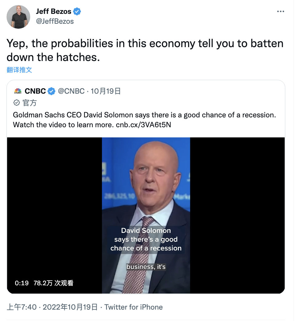 值得注意的是,上個月,貝索斯在推特上向他的粉絲們發出警告,建議他們“未雨綢繆(batten down the hatches)”。貝索斯表示,這一建議主要針對企業主和消費者,認為消費者應該考慮推遲購買大件商品,企業則應該放緩收購和資本支出。