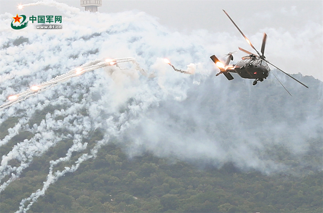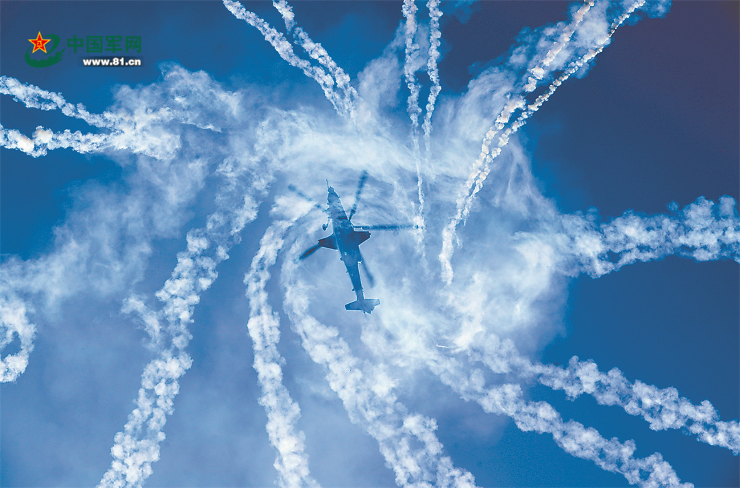 陸軍某空中突擊旅直-20飛機釋放干擾彈。
