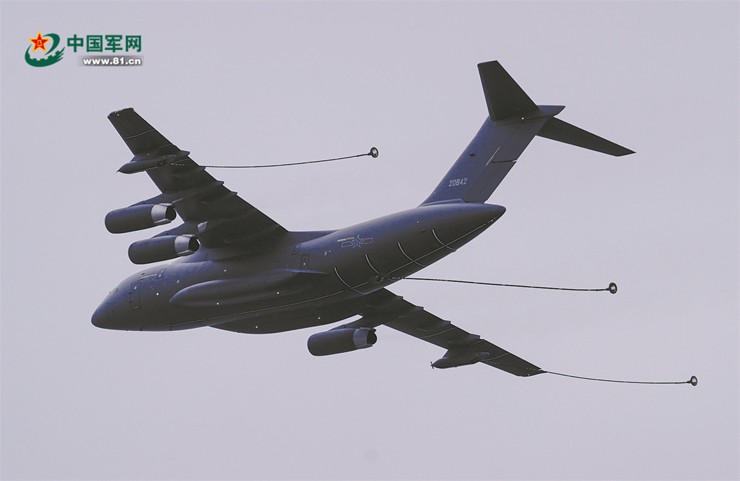 空軍運油-20飛機釋放出3根油管進行飛行表演。