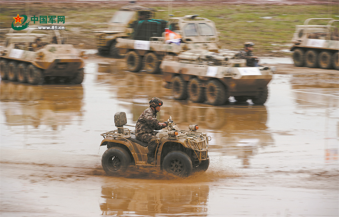 地面動態演示現場,山貓全地形車通過積水泥濘路面。