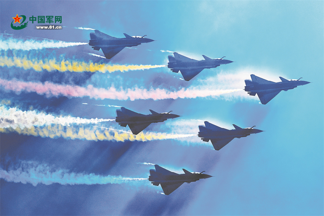 空軍航空大學“紅鷹”飛行表演隊進行特技飛行表演。