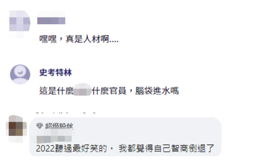 對於諶立中關於青少年自殺率高可能與高樓增加有關的説法,很快在島內引起一些網友的議論。有人在台媒評論區及臉書留言表示:“嘿嘿,真是人才啊…”“這是什麼官員,腦袋進水嗎?”“2022年聽過最好笑的,都覺得自己智商倒退了。”↓