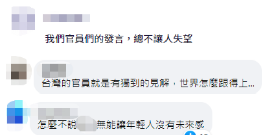 有人諷刺,“我們官員們的發言,總不讓人失望。”“台灣的官員就是有獨到的見解,世界怎麼跟得上。”“怎麼不説當局無能讓年輕人沒有未來感。”↓