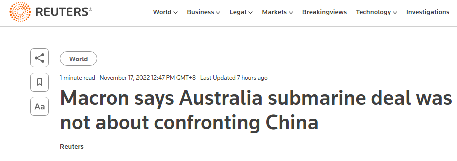 同樣報道該消息的路透社解讀稱,馬克龍是在説,對比澳美英三國簽署的“奧庫斯協議”,法澳此前的常規潛艇採購協議不是為了“對抗”中國。