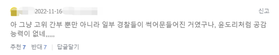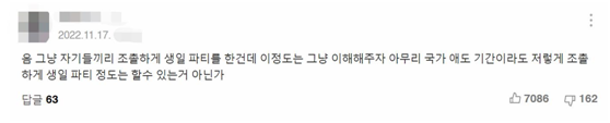 該事件一經曝出,就引發了韓國網民的激烈討論。一位網民認為媒體對相關警員過於苛刻,在報道下留言寫道:“他們不過是自己簡單辦了個生日派對而已,大家就理解下吧。即使是在國家哀悼期間,辦個生日派對不為過吧?”↓