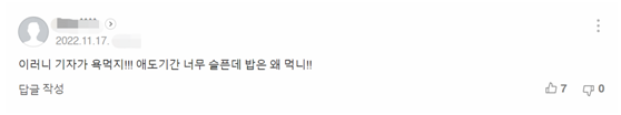 另一名韓國網民則反問發佈稿件的記者稱:“記者您在哀悼期間那麼傷心幹嘛還吃飯啊?”↓
