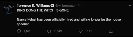 此外,特朗普支持者、美國喜劇演員特倫斯·威廉姆斯也曾於當地時間16日晚發推,稱“叮咚,巫婆走了。南希·佩洛西被正式炒了,不再任眾議長。”↓