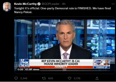 當地時間16日晚,麥卡錫在推特發佈了一段自己接受福克斯新聞採訪的節目片段,他在配文和視頻中均表示:“民主黨統治被終結了。我們已經炒了南希·佩洛西。”↓