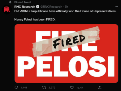 在麥卡錫這條推文之前,美國共和黨全國委員會(RNC)運營的推特賬號“RNC Research”也發推宣佈了共和黨贏得眾議院控制權的消息,並提到佩洛西:“突發:共和黨人正式贏得了眾議院的控制權。南希·佩洛西已經被炒了。”目前,該推文已被其置頂。↓