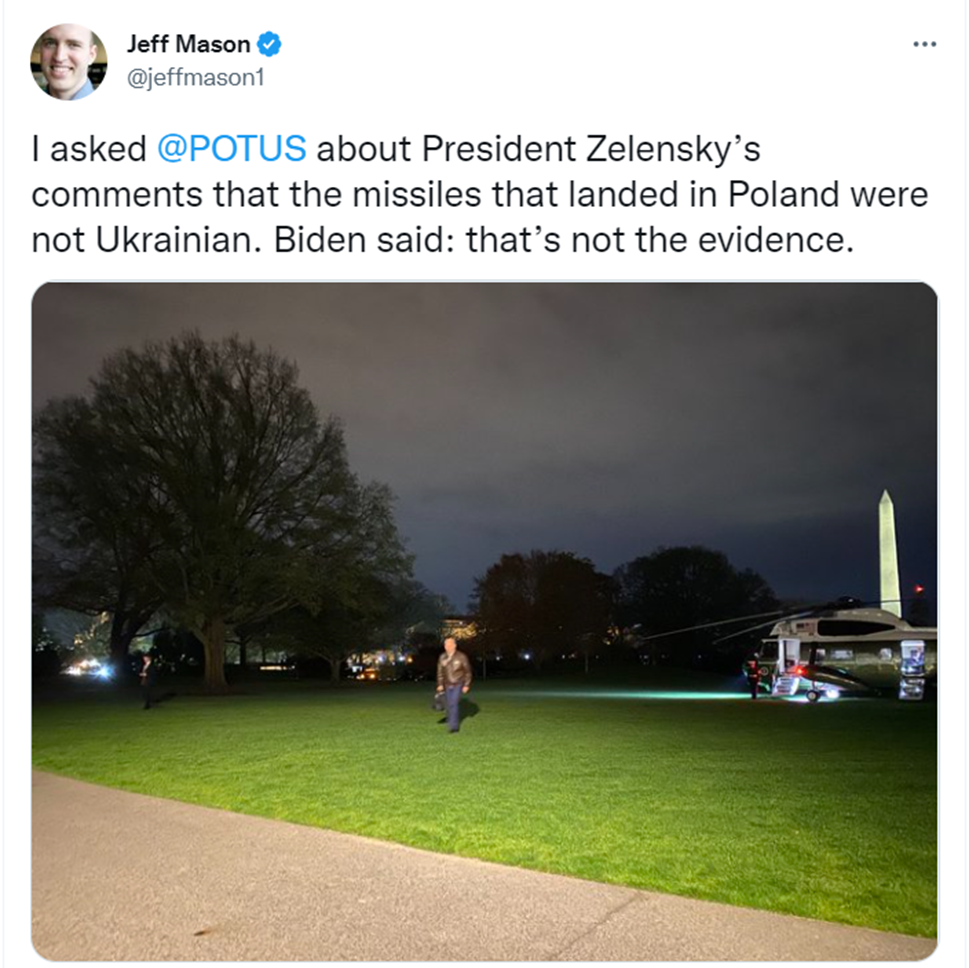 另據俄羅斯《消息報》報道,路透社記者傑夫·馬森17日在推特上透露稱,當時是他向拜登提了這個問題。“我請拜登對澤連斯基總統關於落在波蘭導彈不屬於烏克蘭的説法進行評論,拜登説:‘這不是證據。’”↓