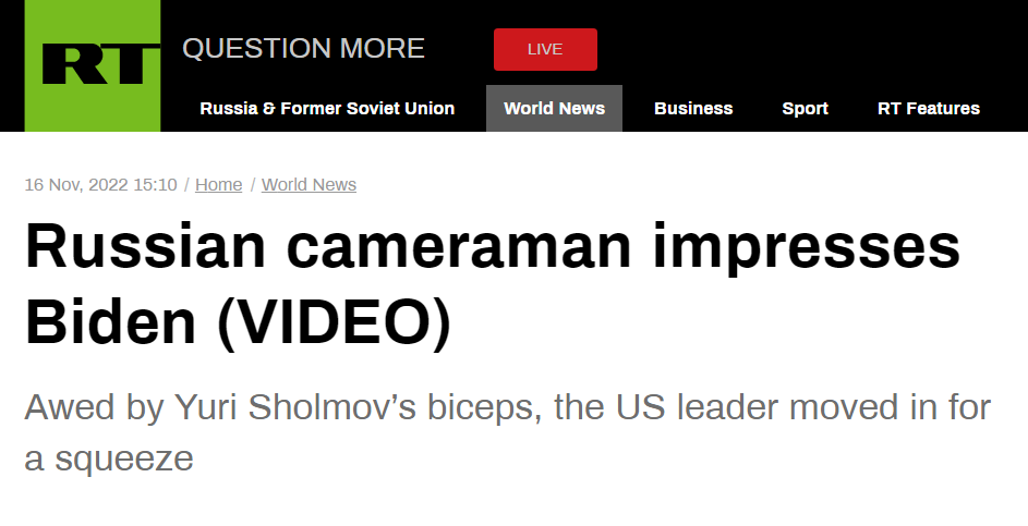 “今日俄羅斯”(RT)題為“俄羅斯攝影記者吸引拜登關注”的報道説,美國總統拜登當地時間15日在印度尼西亞巴厘島參加G20峯會期間,在公開場合評價起一名俄羅斯媒體攝影記者的肱二頭肌,稱他的肱二頭肌和自己的小腿“一樣粗”,還説“希望我們是一邊的”。