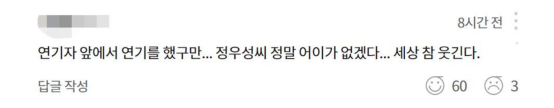 報道一經發布,立即成為韓國網絡上頗具爭議的話題。韓國網民分別在相關報道下發表自己對此事的看法,有網民留言寫道:“(這對母子)可是在演員面前表演啊。鄭雨盛事後一定會感到非常荒唐。這個世界真可笑。”↓