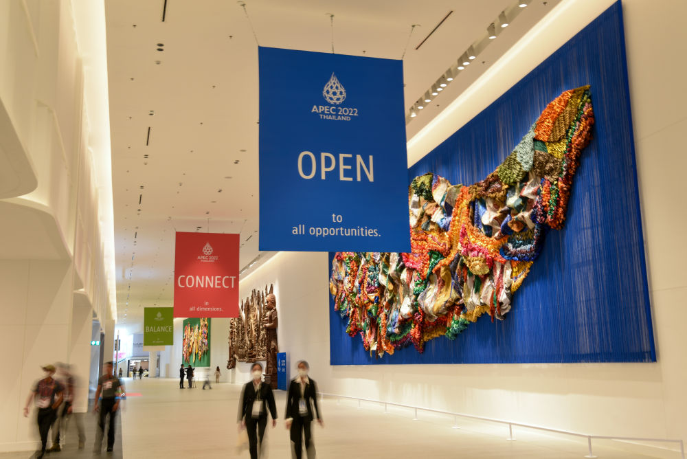 曼谷商業區的詩麗吉王后國家會議中心是亞太經合組織第二十九次領導人非正式會議主會場,藍、紅、綠三色標語格外醒目,組成這次會議的主題“開放、聯通、平衡”。