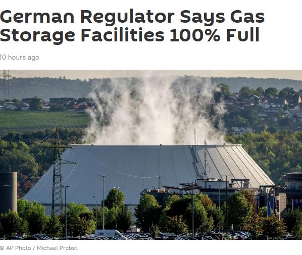 德機構:德國天然氣存儲設施總填充水平已達100%