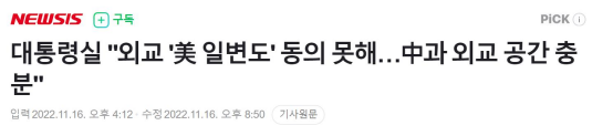 據報道,韓國總統府一位官員在16日下午召開記者會時表示:“很難同意有人説韓國的外交是對美‘一邊倒’路線。”這位官員將韓美同盟稱為是韓國外交的“中心軸”,並介紹韓國的基本外交路線是以韓美同盟為中心,同時加強與中國及其他國家間的合作。“很難將尹錫悦政府上台以來的韓國外交路線看作是突然對美國‘一邊倒’的情況。”這名官員説。