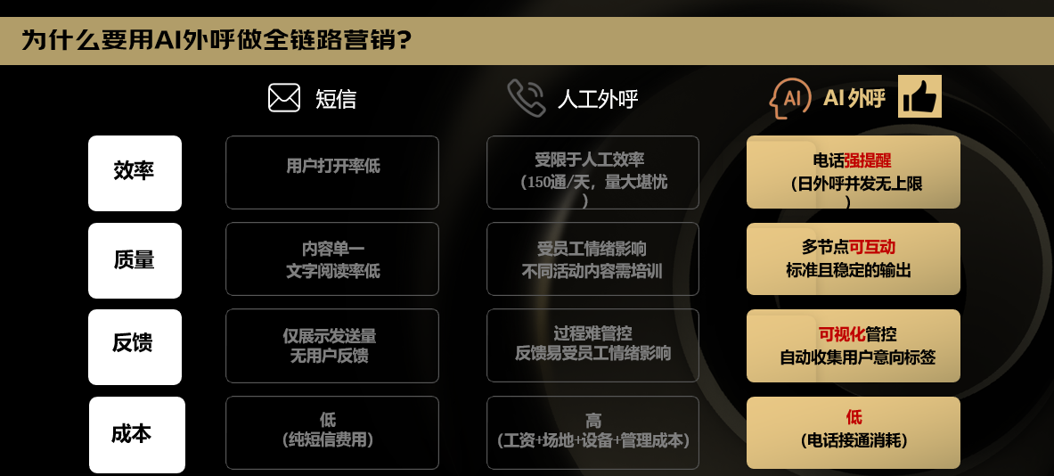 近來年,隨着語音語義識別等技術的飛速發展,智能外呼的交互的體驗已非常逼真。那相比於短信、廣告投放、人工外呼、包裹卡等營銷方式,智能外呼的優勢到底在哪裏?