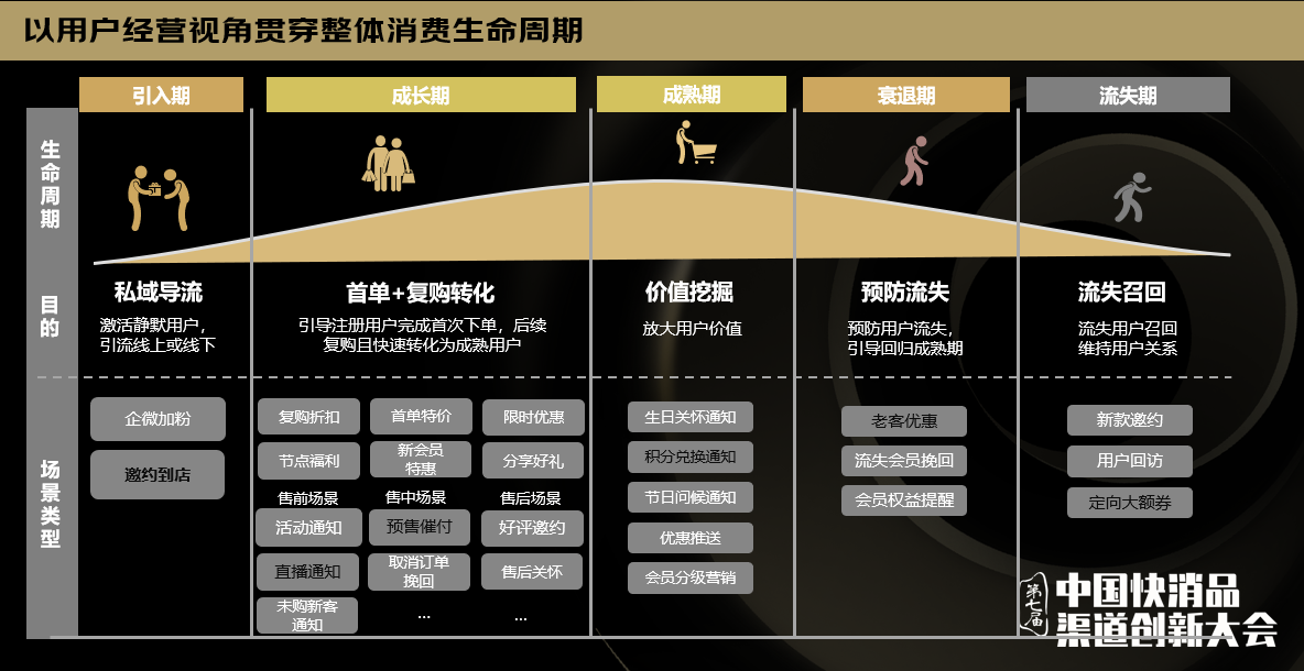 張曉培認為,品牌在私域運營中,一定要以用户經營的視角,來貫穿整個消費生命週期,他把這個週期分為五個階段。