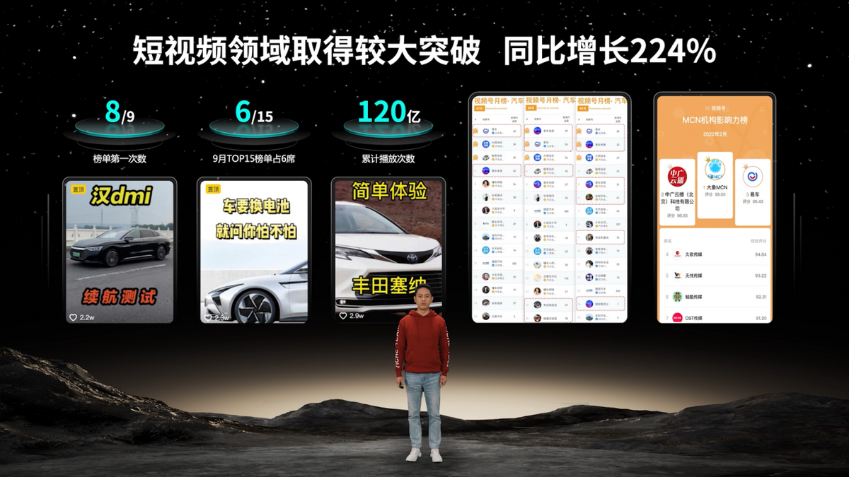 這離不開易車在內容層面的建設和投入,尤其在短視頻領域和專業內容方面成績斐然。據楊永峯介紹,作為騰訊大家庭的重要一員,易車早早便發力視頻號矩陣建設,很快便憑藉過硬的內容質量和鮮明的內容類型深受用户喜愛,牢牢佔據視頻號汽車內容的龍頭位置並取得了長期的霸榜。今年以來,易車視頻號流量取得較大突破,累計播放次數超120億,同比增長224%;前9個月的視頻號·汽車月榜中,易車有8個月排名第一;9月份的前15名榜單中,易車賬號佔據6席。