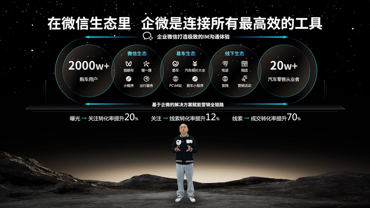 微信生態有着多樣的產品和入口,如何統合各產品和入口的流量並進行有效的營銷運營?張序安給出的答案是企微。他表示,在微信生態裏,企微是連接所有微信產品最高效的工具。在過去一年,易車利用企微構建了一套行之有效的營銷解決方案,在整個微信生態裏跑通了企微工具,賦能主機廠、經銷商營銷全鏈路,使得從曝光到銷售機會到到店再到成交的整個營銷鏈路的效率得到大幅度提升。