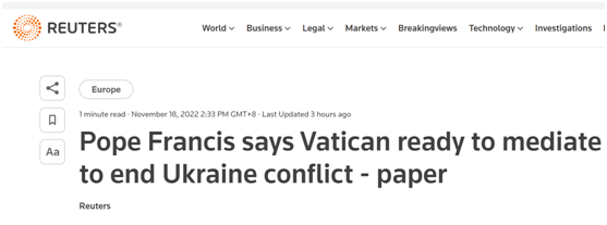 據此前報道,教皇方濟各9月在哈薩克斯坦參加一場國際宗教會議時,呼籲各方儘快結束俄烏衝突,他稱之為一場“毫無意義和悲慘的戰爭”。