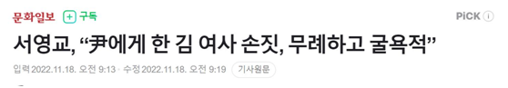 【環球網報道 記者 付嘉駿】綜合韓國YTN電視台、《文化日報》18日報道,當地時間15日在巴厘島舉辦的二十國集團(G20)峯會歡迎晚宴上,各國參會領導人在會場中自由交談,坐在角落裏的韓國第一夫人金建希見狀,開始用手推着身邊的韓國總統尹錫悦並做出示意其“起身過去”的手勢。通過活動現場直播畫面記錄下的這一幕,此後竟成為韓國網絡上熱議的話題。韓國網民認為,當時金建希是在勸説坐在一旁的尹錫悦起身去和其他領導人進行交談。對於金建希的舉動,韓國最大在野黨共同民主黨最高委員徐瑛教17日評論稱,這是“無禮”和“令人感到屈辱”的行為。