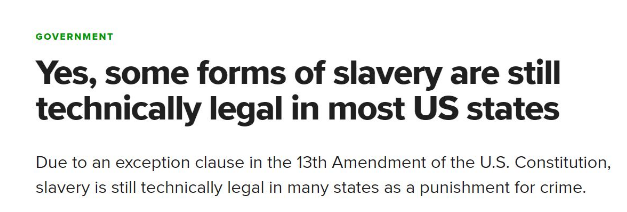1865年,美國在憲法中廢止了奴隸制度,即奴隸屬於奴隸主合法財產的制度,但是157年之後的今天,憲法仍然對罪犯淪為奴隸留下了漏洞。這就使得在美國大部分州,奴隸制作為對犯罪的懲罰仍然是合法的。在2022年的中期選舉中,阿拉巴馬州、田納西州、俄勒岡州、佛蒙特州和路易斯安那州這五個州投票決定是否從各州憲法中刪除這一措辭,爭取全面廢止奴隸制。