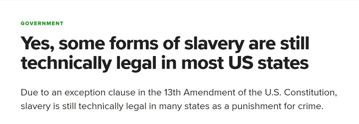 1865年,美國在憲法中廢止了奴隸制度,即奴隸屬於奴隸主合法財產的制度,但是157年之後的今天,憲法仍然對罪犯淪為奴隸留下了漏洞。這就使得在美國大部分州,奴隸制作為對犯罪的懲罰仍然是合法的。在2022年的中期選舉中,阿拉巴馬州、田納西州、俄勒岡州、佛蒙特州和路易斯安那州這五個州投票決定是否從各州憲法中刪除這一措辭,爭取全面廢止奴隸制。