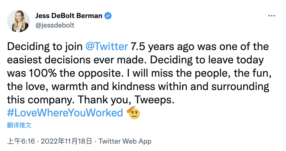 已有員工公開表示自己選擇離職。一名推特員工表示,“7年半前加入推特是我做過的最容易的決定之一,而離開則完全相反。我會想念這裏的人、樂趣、愛、温暖和善意。”