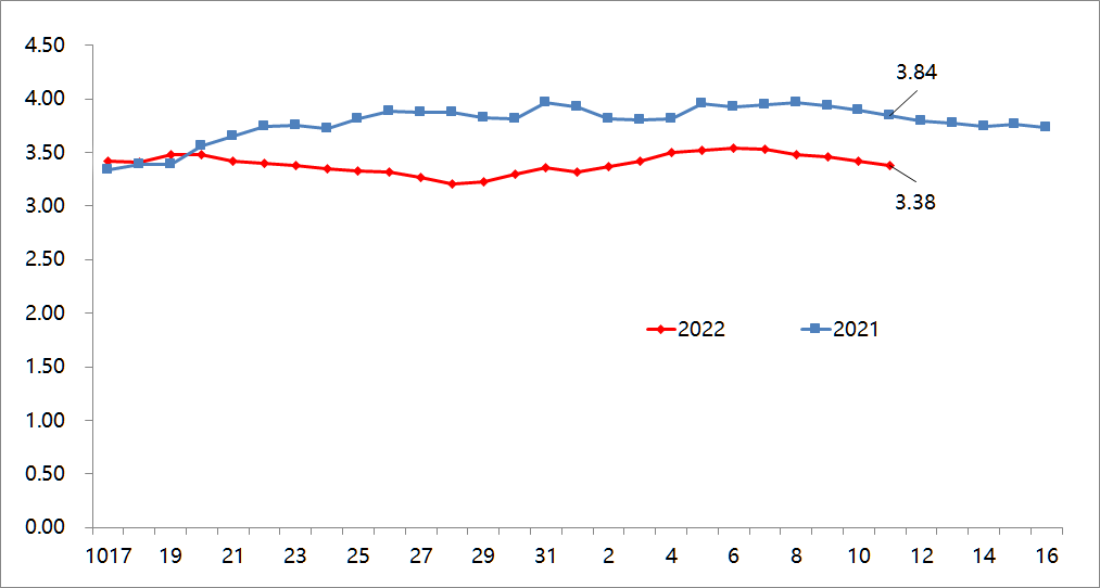 從新發地市場11月份第2周的行情分析來看,11日,新發地市場蔬菜加權平均價是3.38元/公斤,比上週(11月4日)的3.50元/公斤下降3.43%;比去年同期的3.84元/公斤下降11.98%。
