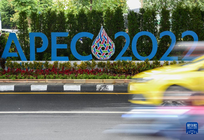 泰國首都曼谷街頭的2022年APEC會議標識。(新華社記者 郭磊 攝)