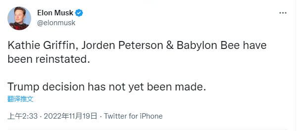 馬斯克發推稱,美國喜劇演員凱西·格里芬、學者喬丹·彼得森以及諷刺網站“巴比倫蜜蜂”的賬號已經被恢復,恢復美國前總統唐納德·特朗普賬號的決定尚未做出。