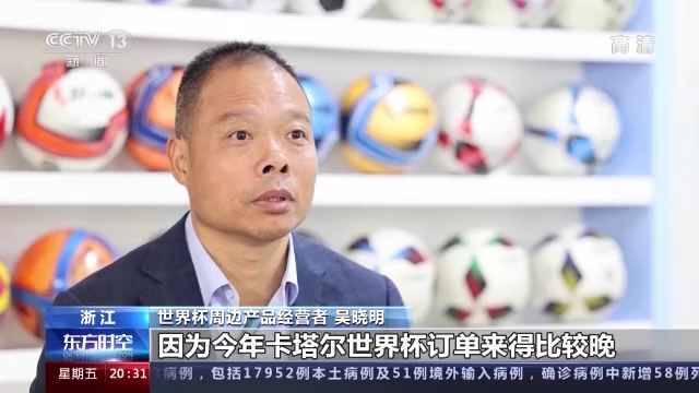 每逢世界盃週期,身為“世界超市”的義烏自然不會缺席。今年的卡塔爾世界盃,“超過一半的周邊產品來自義烏”“義烏製造踢進世界盃”等話題早已在網上引起熱議。世界盃前,經營者吳曉明拿到了紀念品足球的官方授權,訂單為10萬個足球。