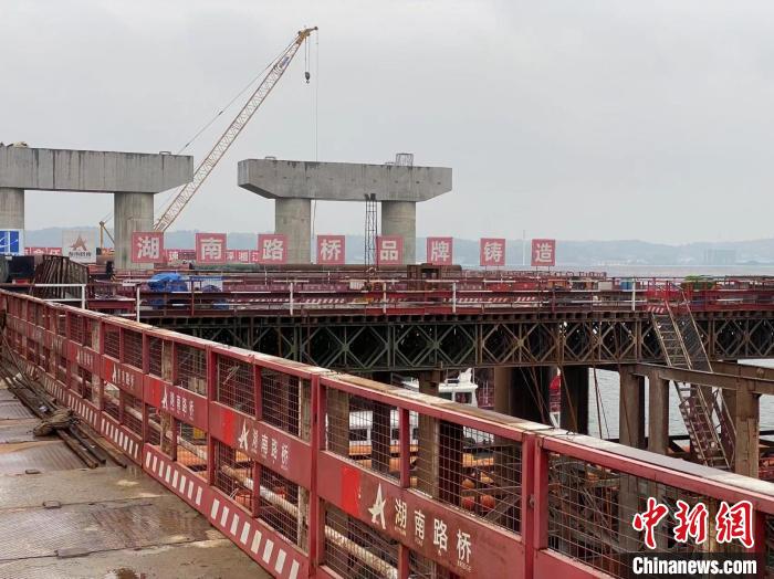 跟隨機器轟鳴聲,走向暮坪湘江特大橋建設施工現場,只見涉水引橋首跨鋼槽梁由兩岸向江心延伸,不日即可合龍。