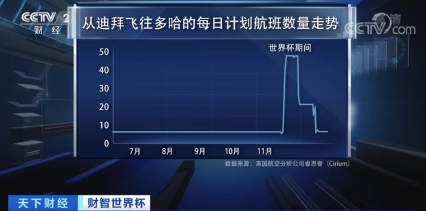 從這張圖可以看到,在世界盃期間,從迪拜到卡塔爾多哈的每日計劃航班數量有明顯的增長。