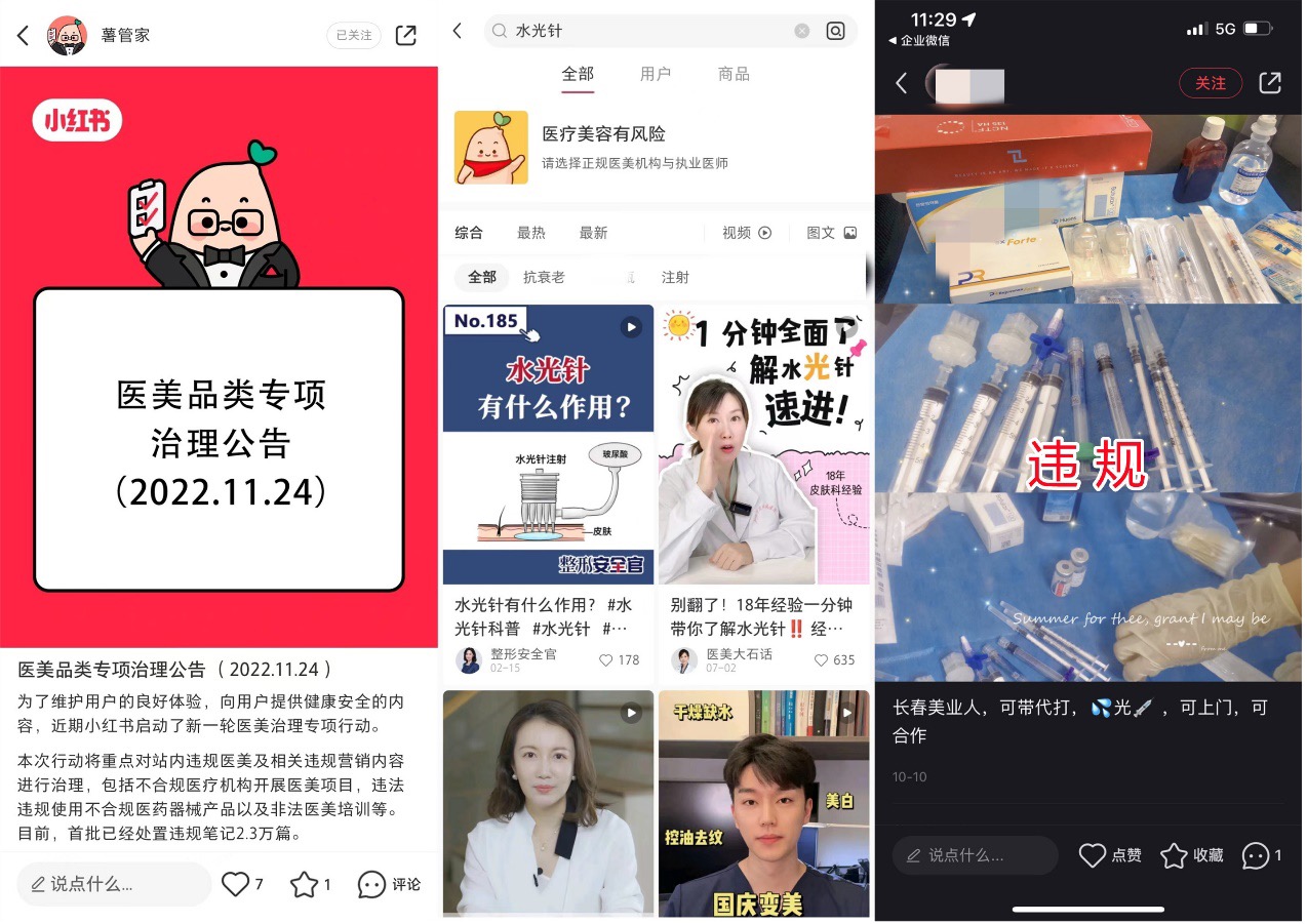 這是小紅書在2022年內第三次對醫美內容進行專項治理。今年1月19日,小紅書封禁了6家線下醫療美容機構與7個相關品牌。2月17日,小紅書又開展號稱“有史以來最嚴格的醫美專項治理行動”,取消了216傢俬立機構認證,並對一大批違規賬號、筆記採取了清理下架、封號、降級處理。