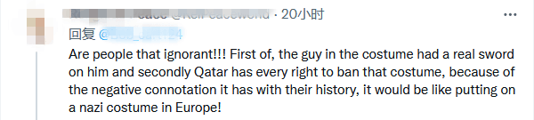 英國一個關注“伊斯蘭恐懼症”的慈善組織“Tell Mama”的負責人伊曼·阿塔(Iman Atta)表示,“我們的球迷應該注意到,有些事情可能會冒犯卡塔爾公民,比如公開飲酒、身穿十字軍聖殿騎士團的歷史服裝,這些行為在該地區會產生非常負面的影響。”