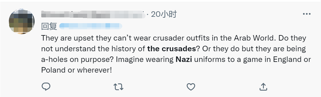 反對足球種族主義的英國組織“Kick It Out”稱,“我們要提醒觀看世界盃比賽的球迷們,身穿某些服裝,比如代表騎士或十字軍的服裝,在卡塔爾或其他伊斯蘭國家可能不會受到歡迎。(英國)外交部在賽前發佈的旅遊建議中表示,球迷們應該熟悉當地的風俗,我們鼓勵球迷們如此處理。”