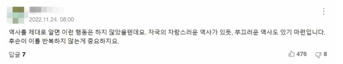 與此同時,也有韓國網民理性表示:“如果能正確地理解歷史,就不會做出這種行為。每個國家都有自己值得驕傲的歷史,但也一定會有令自己蒙羞的歷史。怎樣讓後代不再重演這樣的歷史才是最重要的。”↓