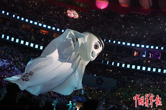 11月20日,卡塔爾海灣球場,2022年卡塔爾世界盃開幕式上,吉祥物“拉伊卜”在球場上空飛翔。在本屆世界盃上,吉祥物“拉伊卜”的手辦和毛絨玩偶是由中國東莞一家企業設計製造的。