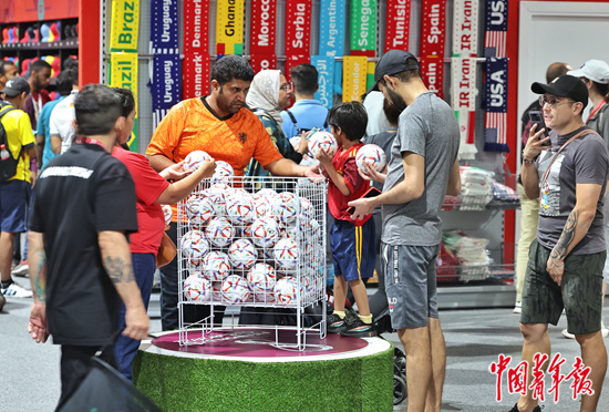 11月19日,卡塔爾多哈貝達公園球迷廣場的世界盃紀念品商店裏,球迷們在挑選小足球。這些紀念商品中的70%來自“中國製造”。