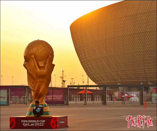 11月17日,卡塔爾,負責盧賽爾體育場維護運營的工人穆罕默德·沙伊布在盧賽爾體育場廣場上的“大力神杯”旁休息。盧賽爾球場也被稱為“大金碗”,是本屆世界盃的主場館。這座球場由中國鐵道建築集團統籌建設,凝聚着中國製造、中國科技的智慧。