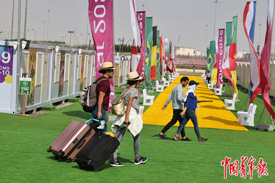 11月19日,卡塔爾,兩名拖着行李箱的球迷辦好手續,準備入住集裝箱“球迷村”。這個位於多哈西部艾哈邁德·本·阿里體育場附近的“球迷村”可以滿足1000多人的住宿要求。