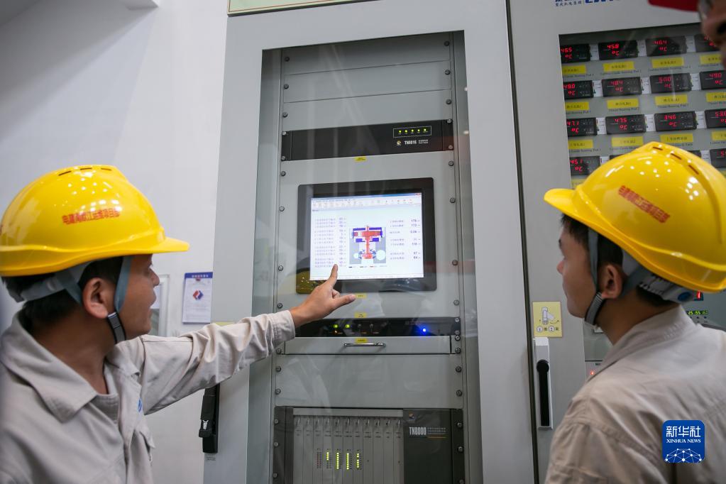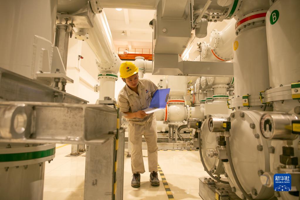 2022年9月27日,在老撾北部豐沙裏省,中國電建南歐江流域梯級水電項目七級電站的工作人員檢查運營情況。新華社發(凱喬攝)